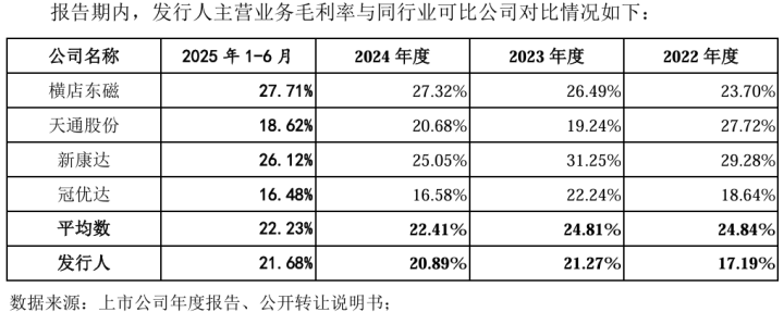 公司业绩表现与行业趋势总体一致,即软磁铁氧体销售额总体下降、销量增长趋缓。更值得关注的是,主营业务毛利率长期低于行业平均水平:2024年为20.89%,低于行业均值的22.41%;2025年上半年回升至21.68%,仍低于行业均值的22.23%。这表明公司产品主要集中于技术壁垒低的竞争领域,议价能力受限。与此同时,其他业务如磁心、电子元器件等未能形成有效利润增长点,使整体业绩增长基石显得单薄。